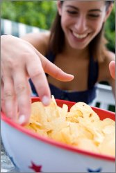 While regular potato chips have their own issues as well, light potato chips are not an acceptable alternative. Try air popping some organic popcorn and adding some sea salt and spices for flavor instead.